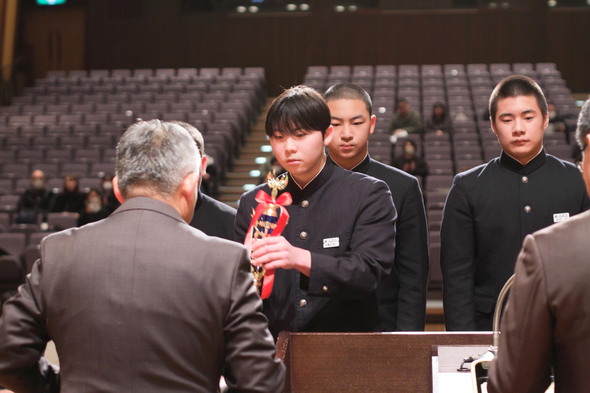 町役場内教育委員会窓口にて、賞状および記念品の受け渡しをしています。