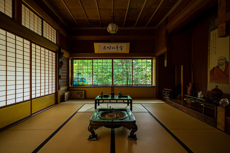 大正9年(1920)宮越家9代当主正治が、イハ夫人33歳の誕生祝と厄除けを兼ねて建立したと伝えられます。大正浪漫あふれる空間は、夫妻が詩歌を詠む舞台として「詩夢庵」と命名されました。棟梁をはじめ、建設に携わった人々の名前は明らかとなっていませんが、天井や壁、縁側や床の間には銘木や高級建材が惜しげもなく投入され、丁寧な仕上げが施されています。