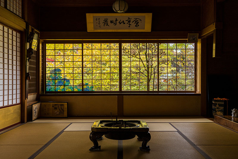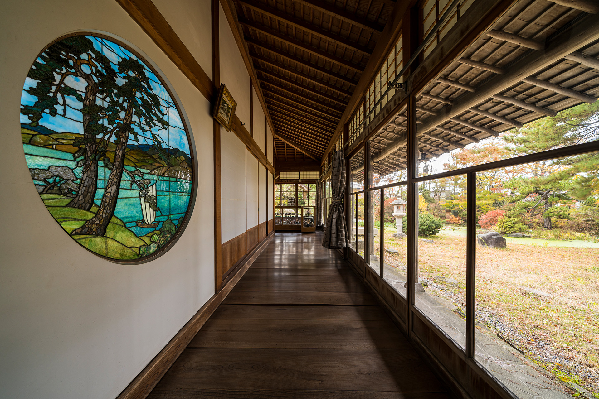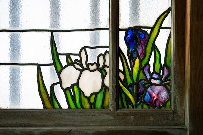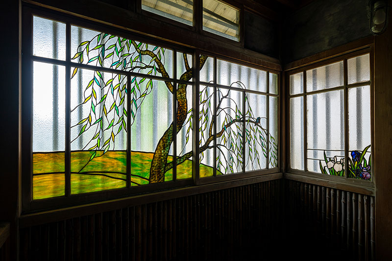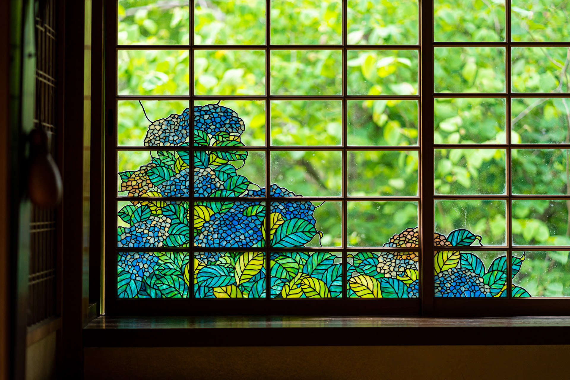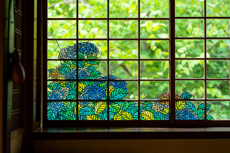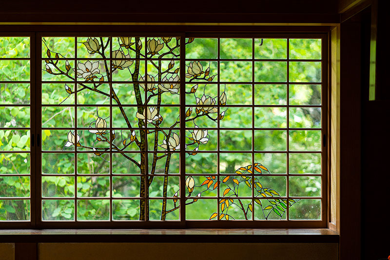 奥の間、山蘭の間など格式のある座敷に比べ、より趣向性の高い造りになっています。それらの特徴が最も表われているのが、窓を飾るステンドグラスです。障子4枚組に配された花木によって早春・初夏・初秋、余白を初冬に見立てて季節の移ろいを表すとともに、背面の庭木を借景としています。早春の訪れを真珠色で表現したモクレン(あるいはコブシ)を挟んで、左に青・緑・黄色のアジサイ、右に抑えた朱色のケヤキ(あるいはハゼ)が色づきます。