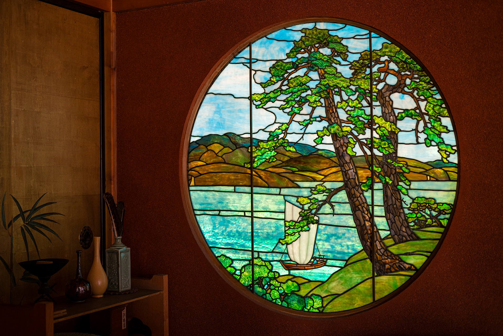 山蘭の間に進む入口部に相当します。外光が抑制された薄暗がりの中に、古来多くの物資や人が行き交った「十三潟」の景観をモチーフとしたステンドグラス作品が浮かび上がります。小川三知が得意とする白砂青松の図案が円窓の構図で表されるとともに、裏側にティファニー様式とよばれるガラスを重ねる高度な技法が用いられています。光が透過すると十三潟の水面にさざ波が寄せる三知の孤高の技がうかがわれます。