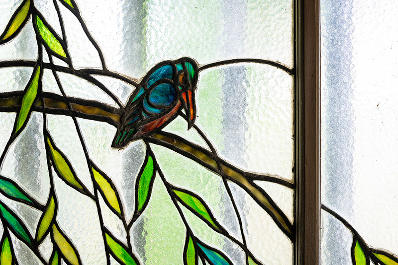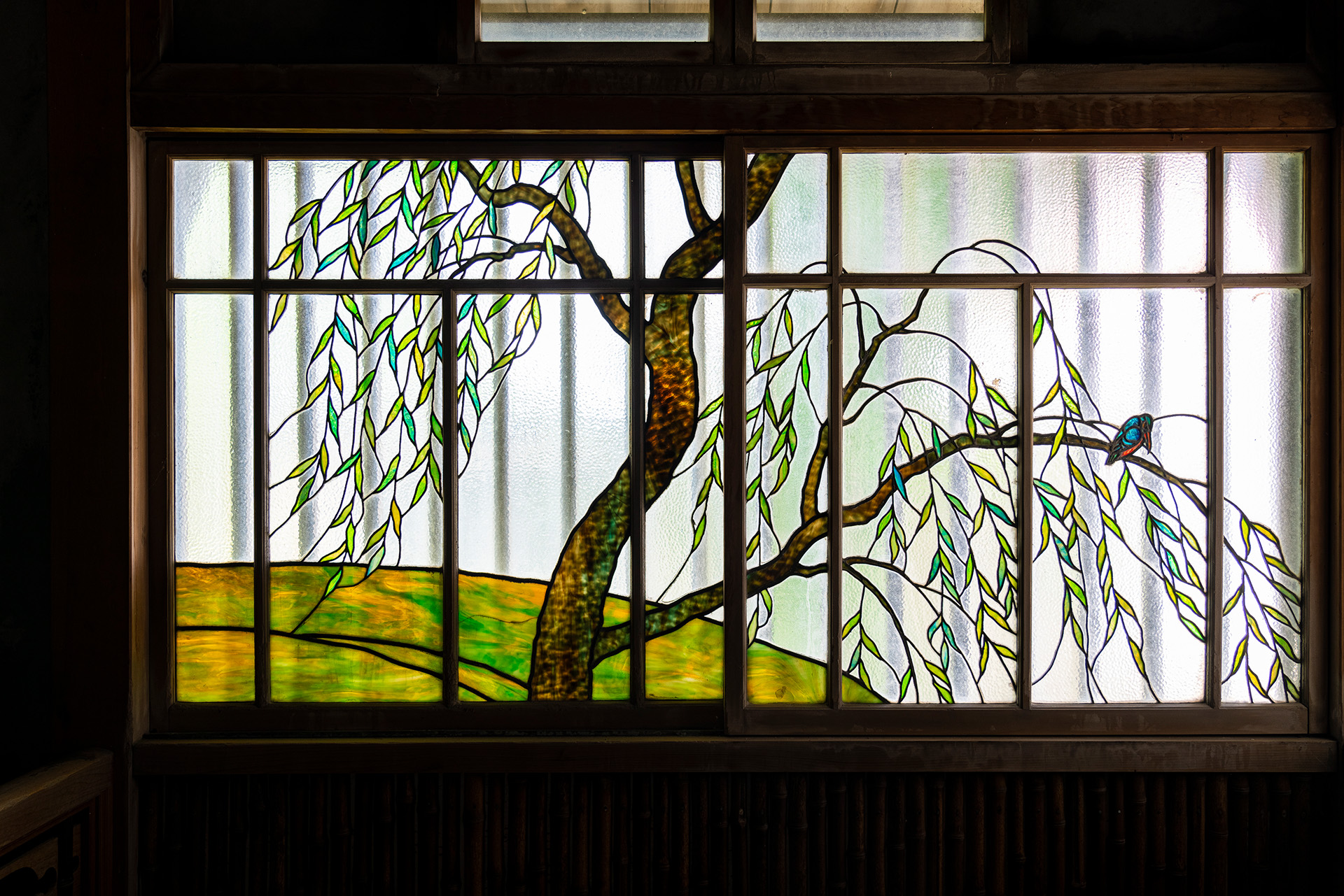 カワヤナギにカワセミ、ショウブ(アヤメ)を配した水処にふさわしい図案のステンドグラスが飾られています。宮越家の池泉庭園には、初夏アヤメが咲き誇り、カワセミも飛来することから、実際に風呂場の窓から見える情景を切りとったとも考えられます。いまにも葉が揺れ出しそうなやわらかな風を感じさせるカワヤナギに、水面を睨む鋭い眼と嘴のカワセミ、鮮やかなコントラストが印象的な小川三知ならではの作品に仕上がっています。