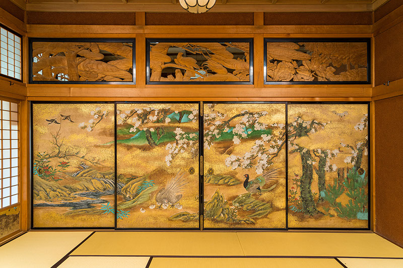また、建具についても、襖絵は狩野山楽・岩佐又兵衛・狩野常信といった安土桃山から江戸前期に活躍した絵師の作と伝えられるほか、窓は小川三知作のステンドグラス、欄間は能面師後藤良の彫刻で飾られました。調度も贅が凝らされ、正治夫妻の審美眼に適った家具や文房具・茶道具ほか、近世から近代の書画が邸内を彩っていました。
