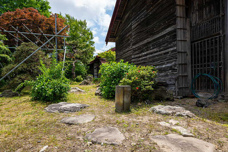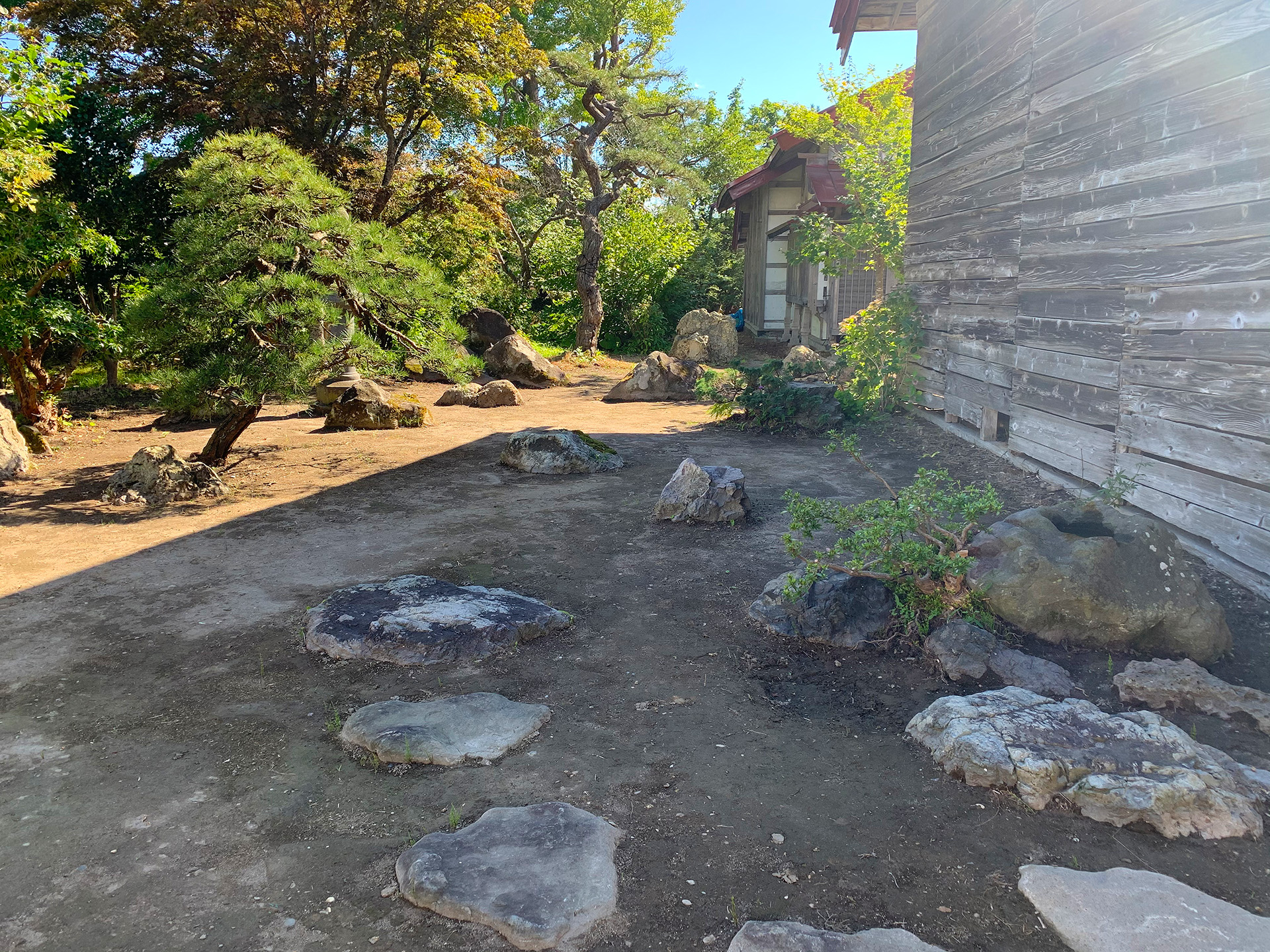 主屋に付随した庭園であり、明治初期の主屋の改変に併せて築庭されたと考えられます。後年の文庫蔵・離れ建築等により、一部毀損・改庭が認められるものの、初現的様式が残されていることから、発見例の極めて少ない「初期大石武学流庭園」と評価されています。