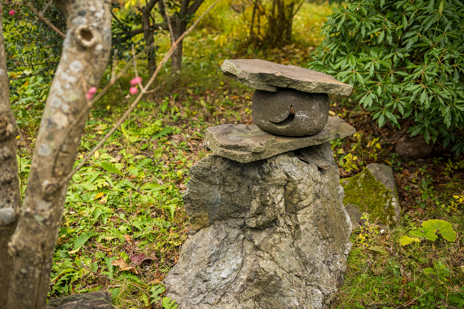 一般的な庭園ではほとんど見られない各種の石造文化財は、越前地方をはじめとする各地から運ばれたものであり、京都の白沙村荘(国名勝)の影響がうかがわれます。