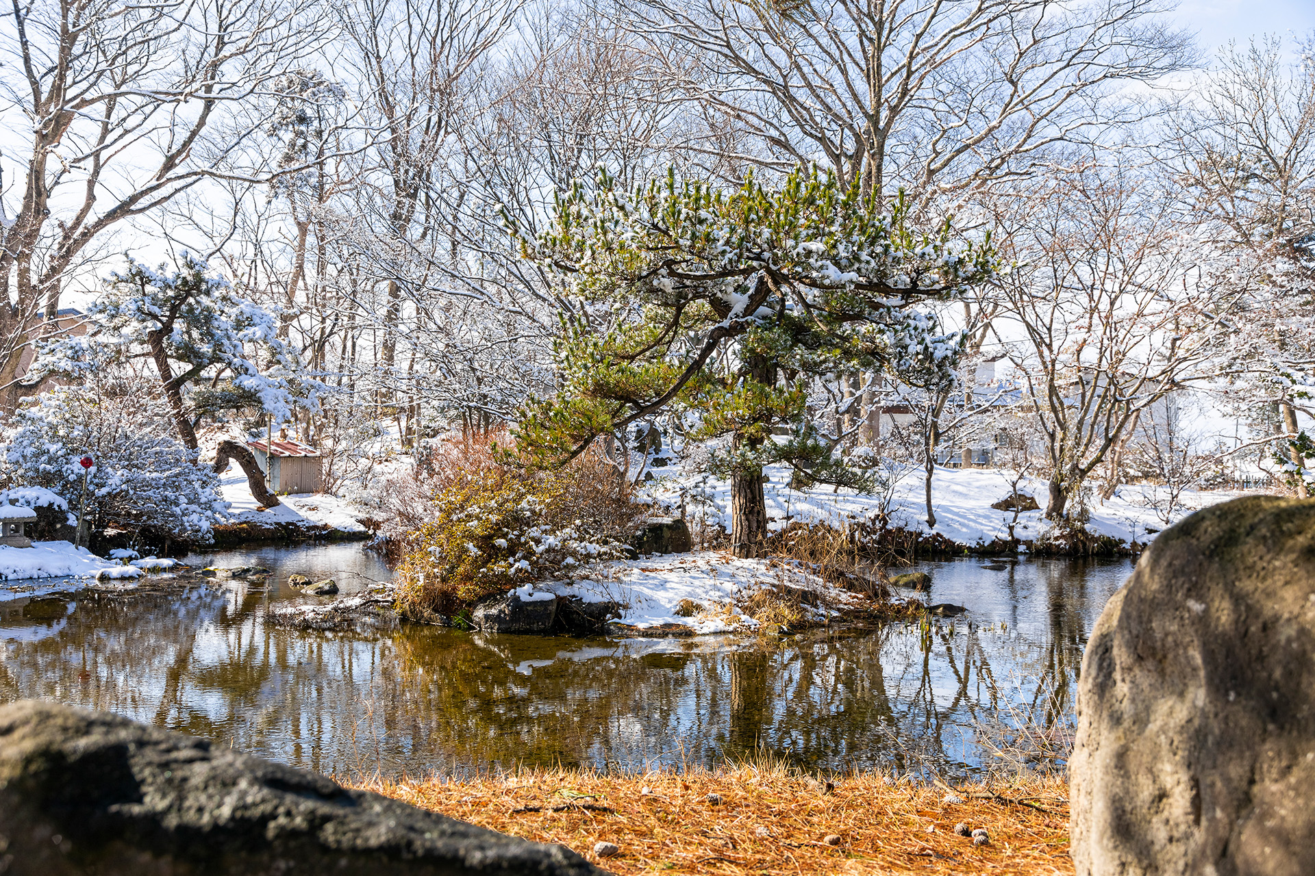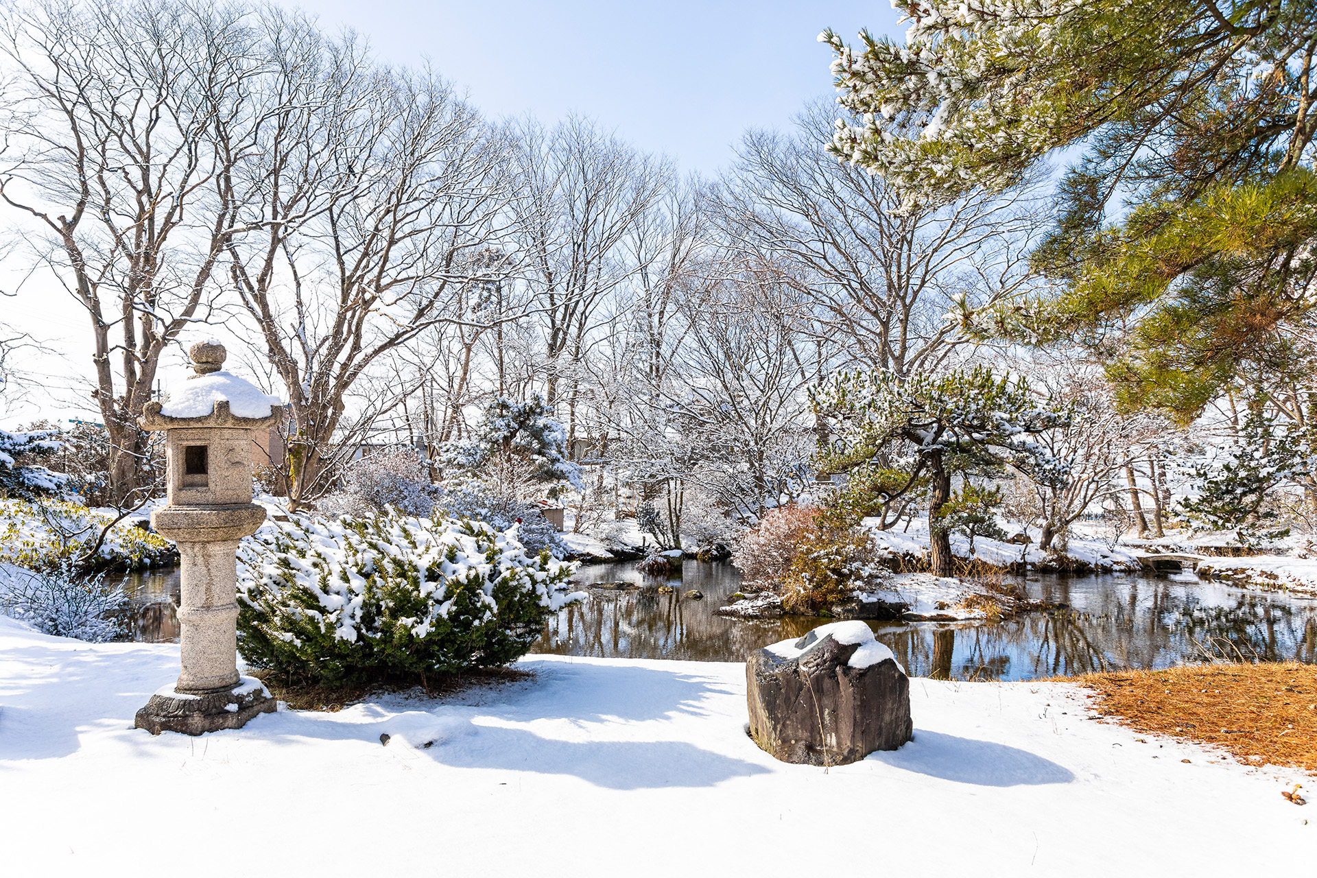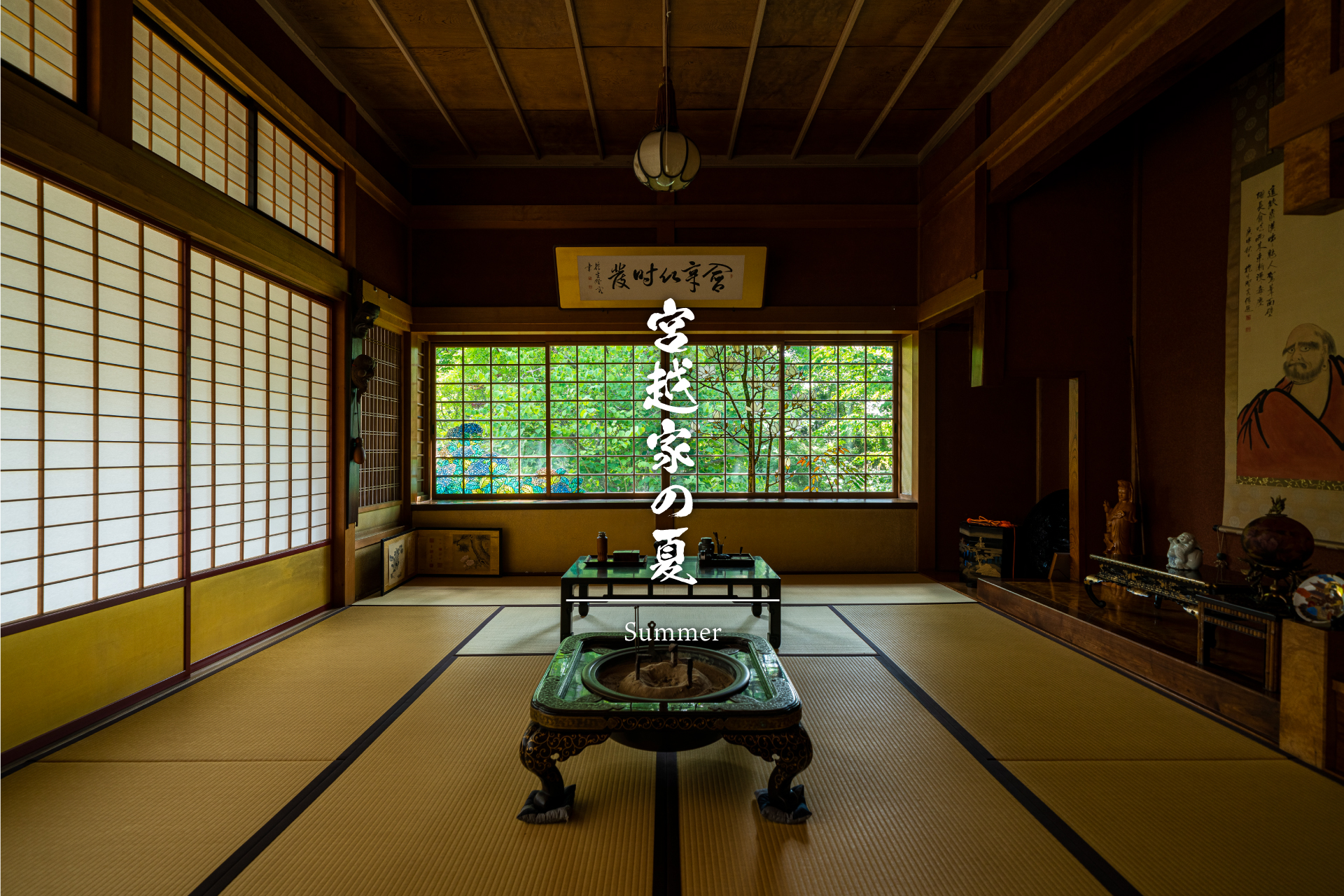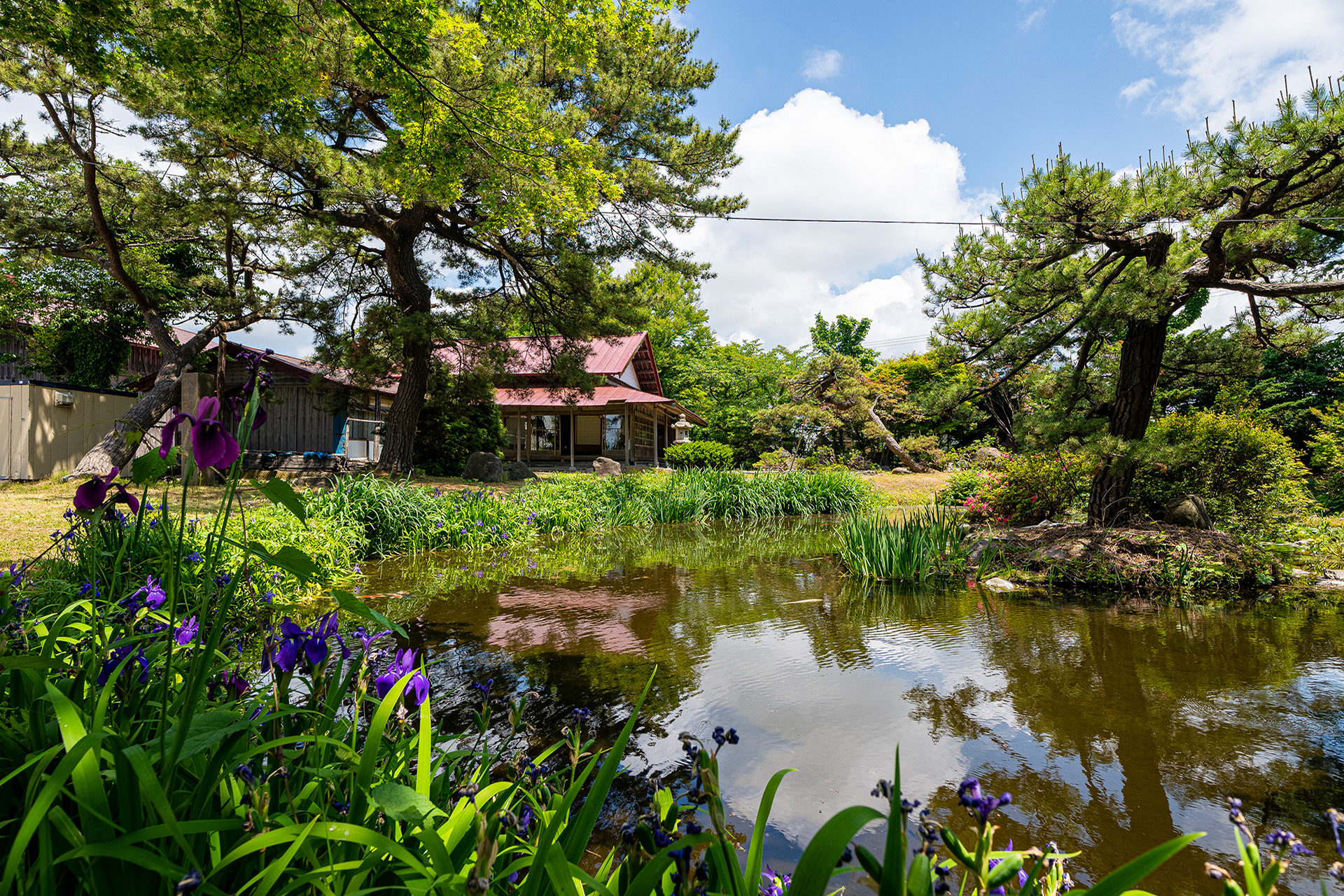 紫色の菖蒲が水辺を彩る夏の静川園。