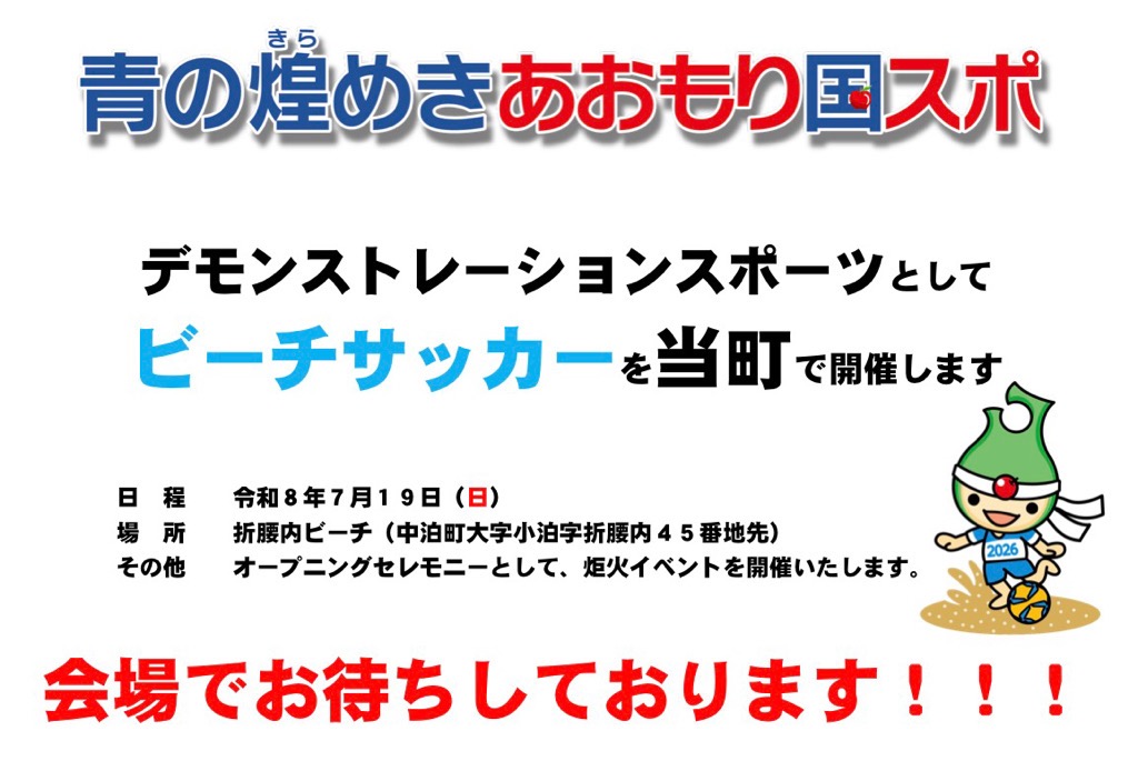 令和8年に開催する第80回国民スポーツ大会冬季大会・本大会の競技会場地(デモンストレーションスポーツ:ビーチサッカー)として、令和5年8月31日付けで決定を受けました。