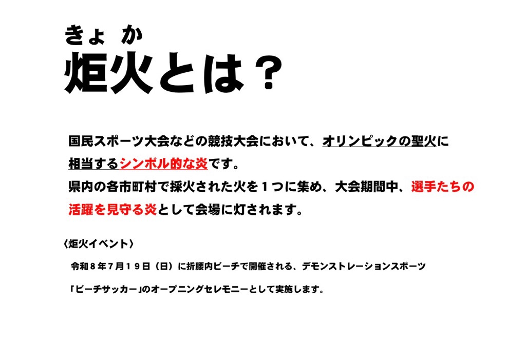 当町では、デモンストレーションスポーツとして折腰内ビーチで「ビーチサッカー」を開催するので、オープニングセレモニーとして炬火イベントを実施する予定です。