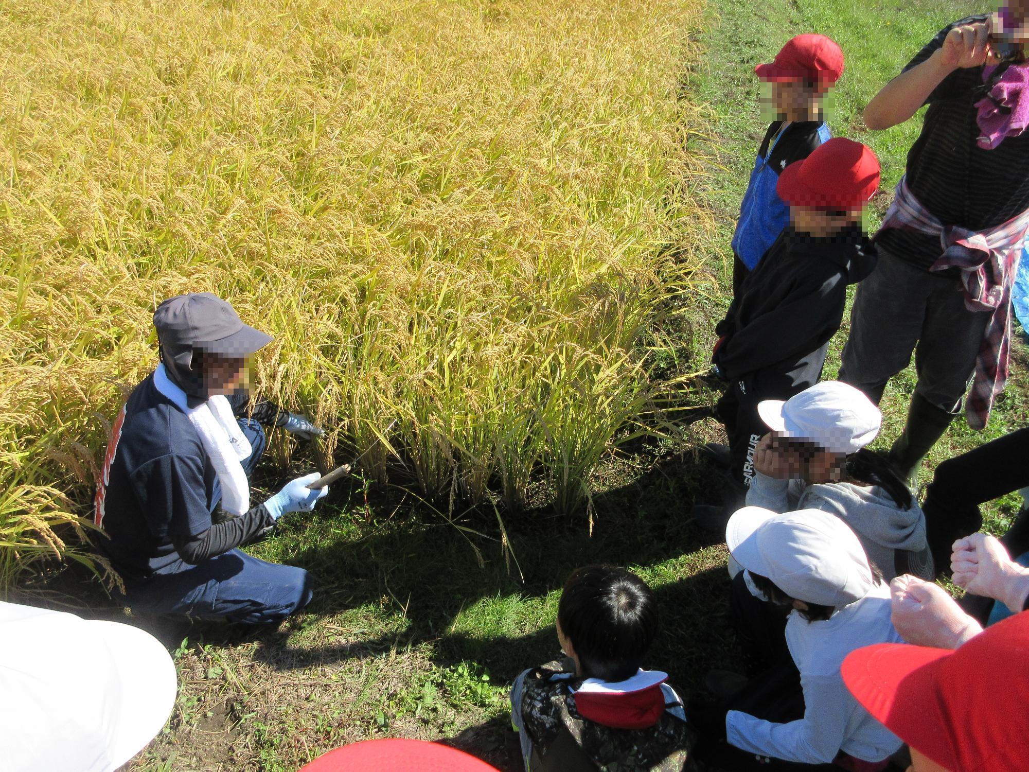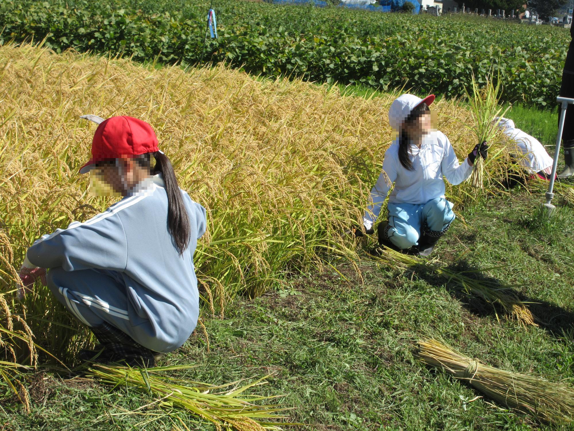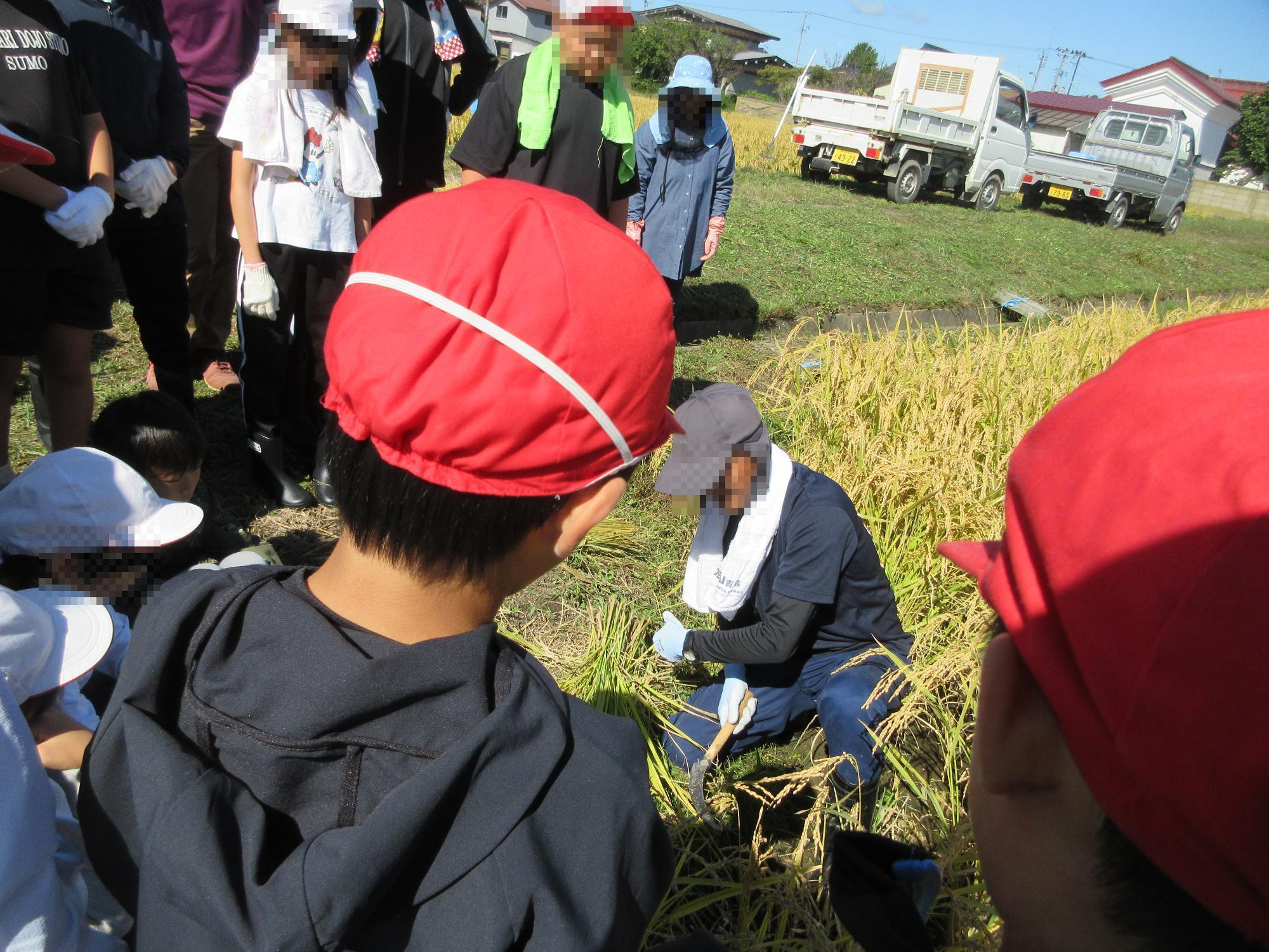 春、学校評議員さんの田んぼに植えた稲の苗が豊かに実り、稲刈りを体験してきました。
