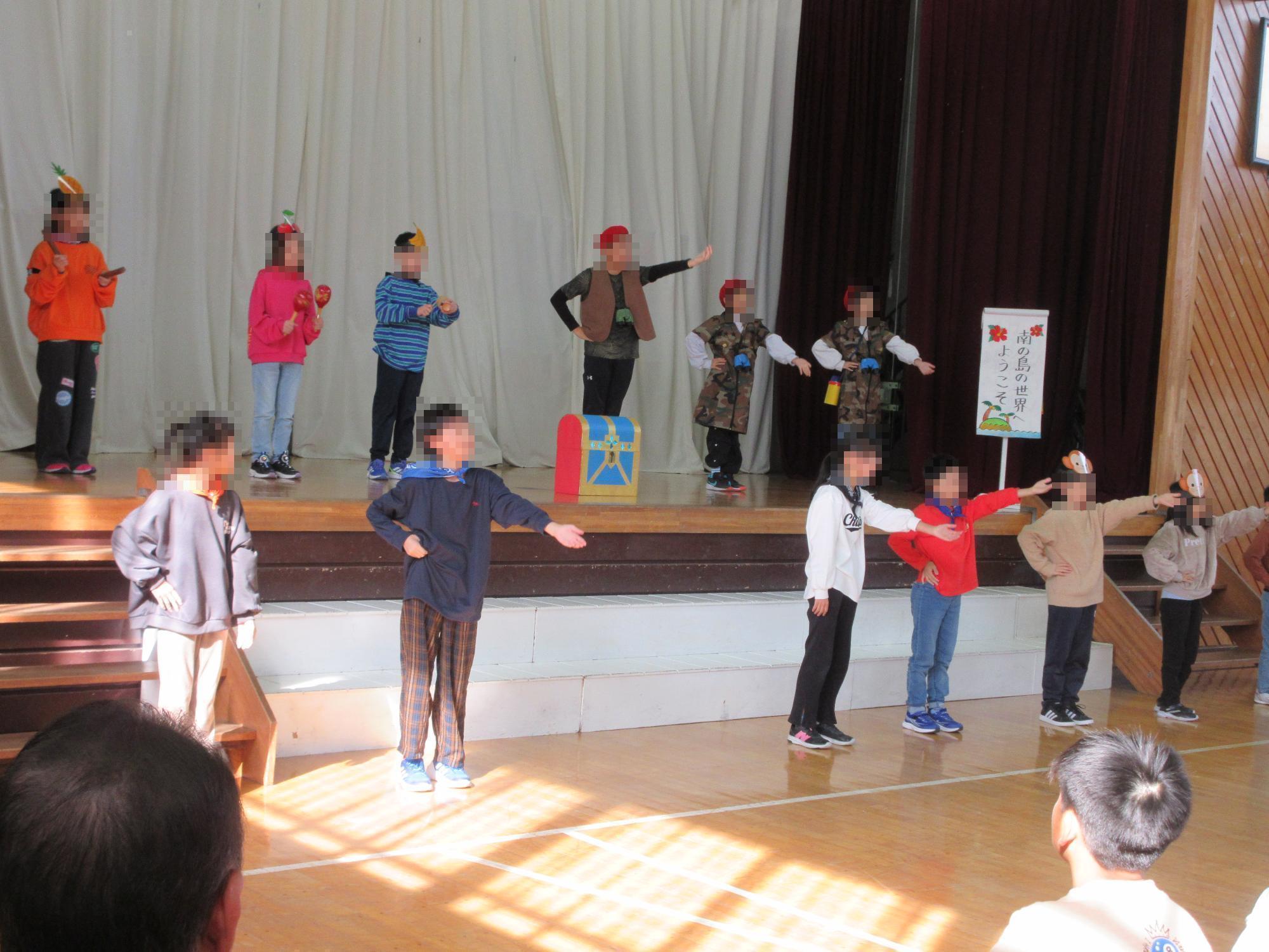 校長先生の挨拶ではじまった後半の部。続いては5年生の劇、いのち輝くメラメラ万博。