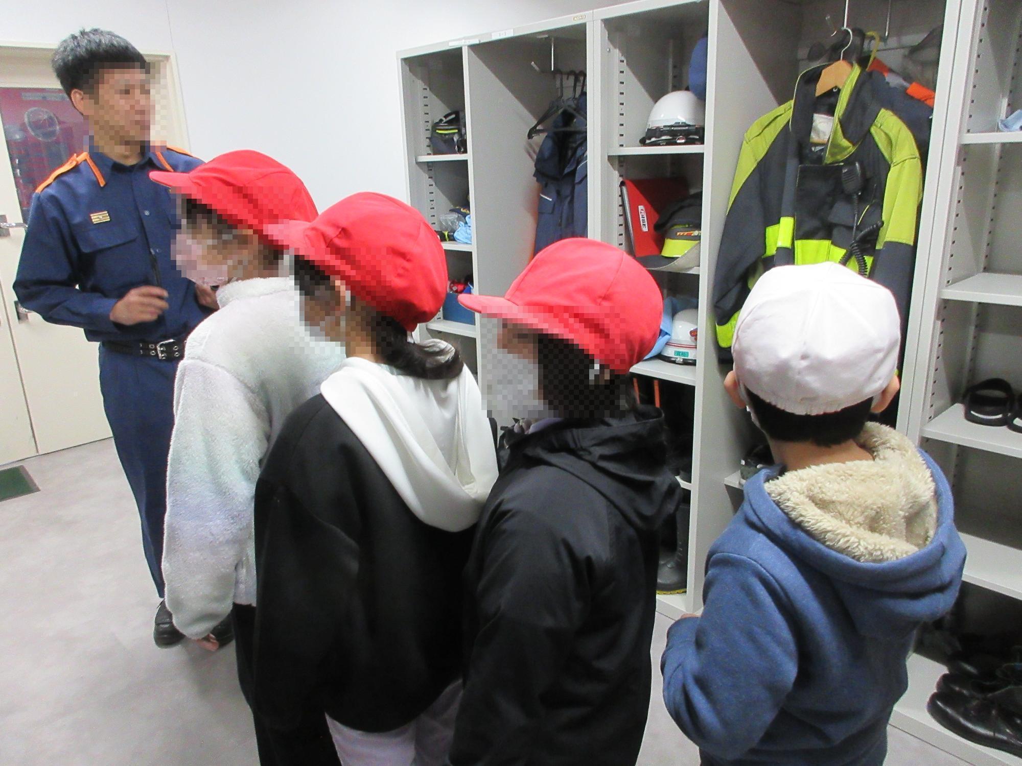 3年生が防火教室に参加してきました。消防署内の設備や隊員の皆さんが身に着ける装備を見学したり