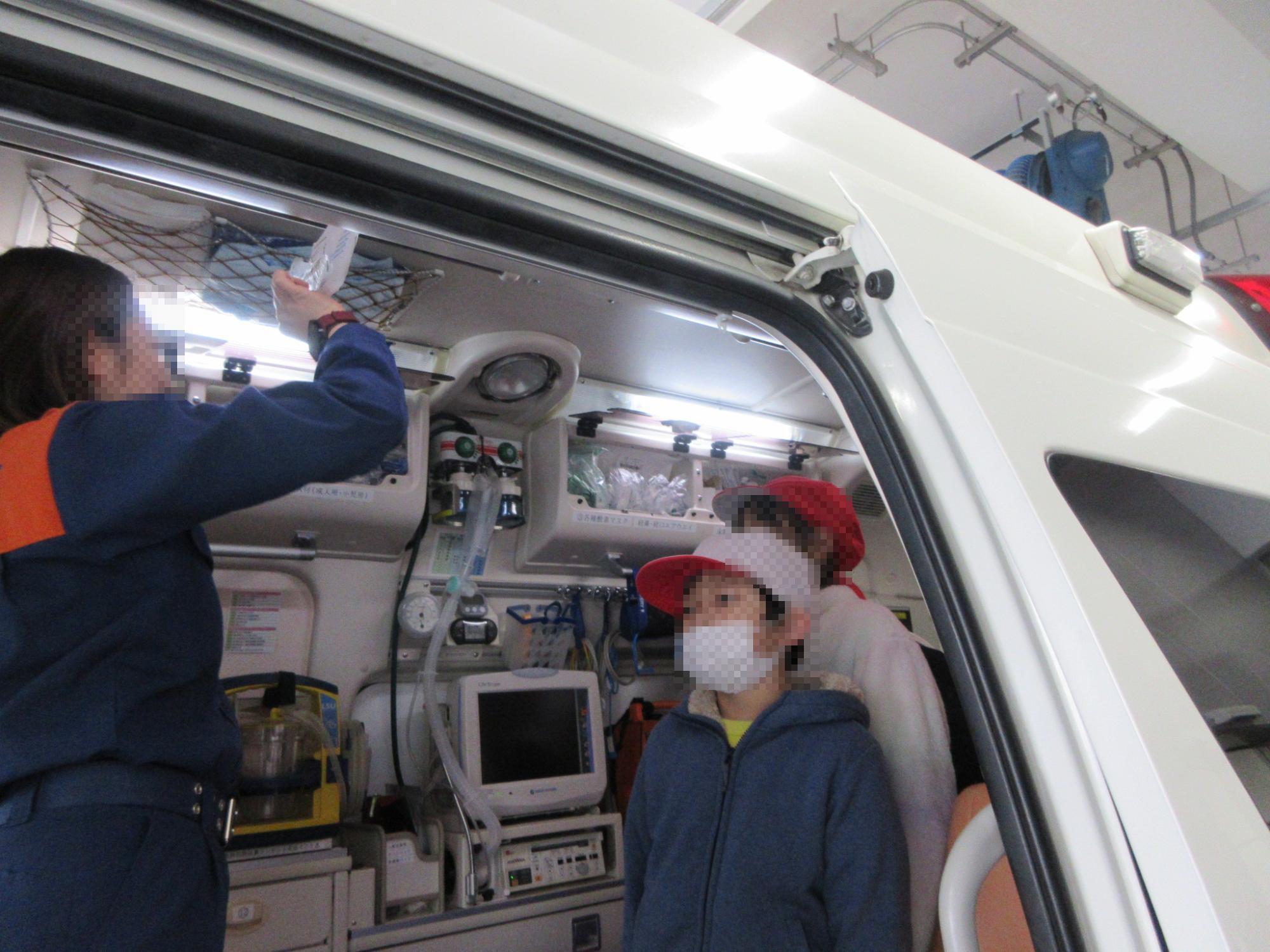消防車や救急車に乗せてもらったり、中にあるいろいろな道具を見たりしながら説明を聞きました。