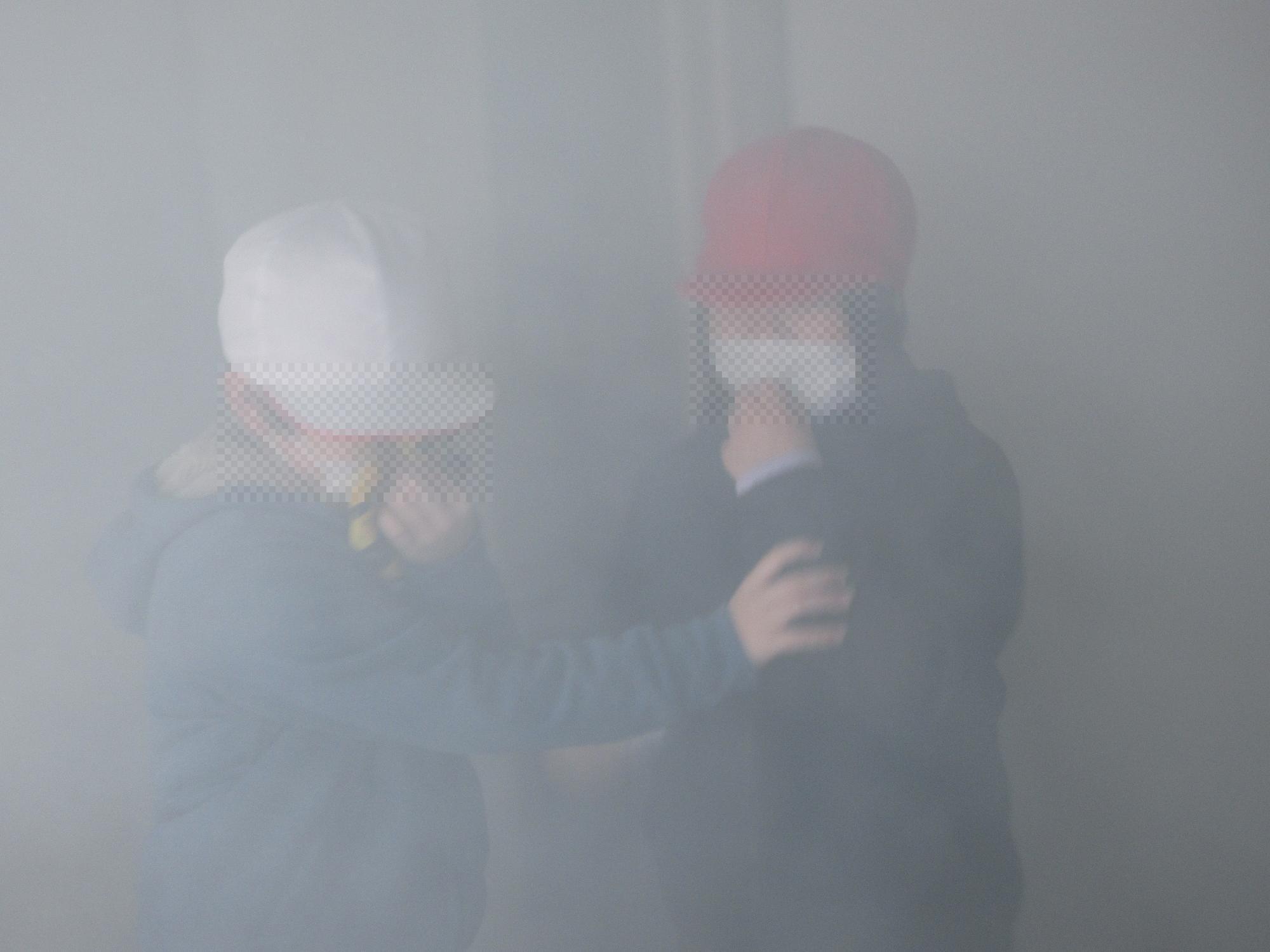 けむり体験ハウスの中で行われた避難訓練では、学校では経験できない視界の悪さにびっくりしていました。