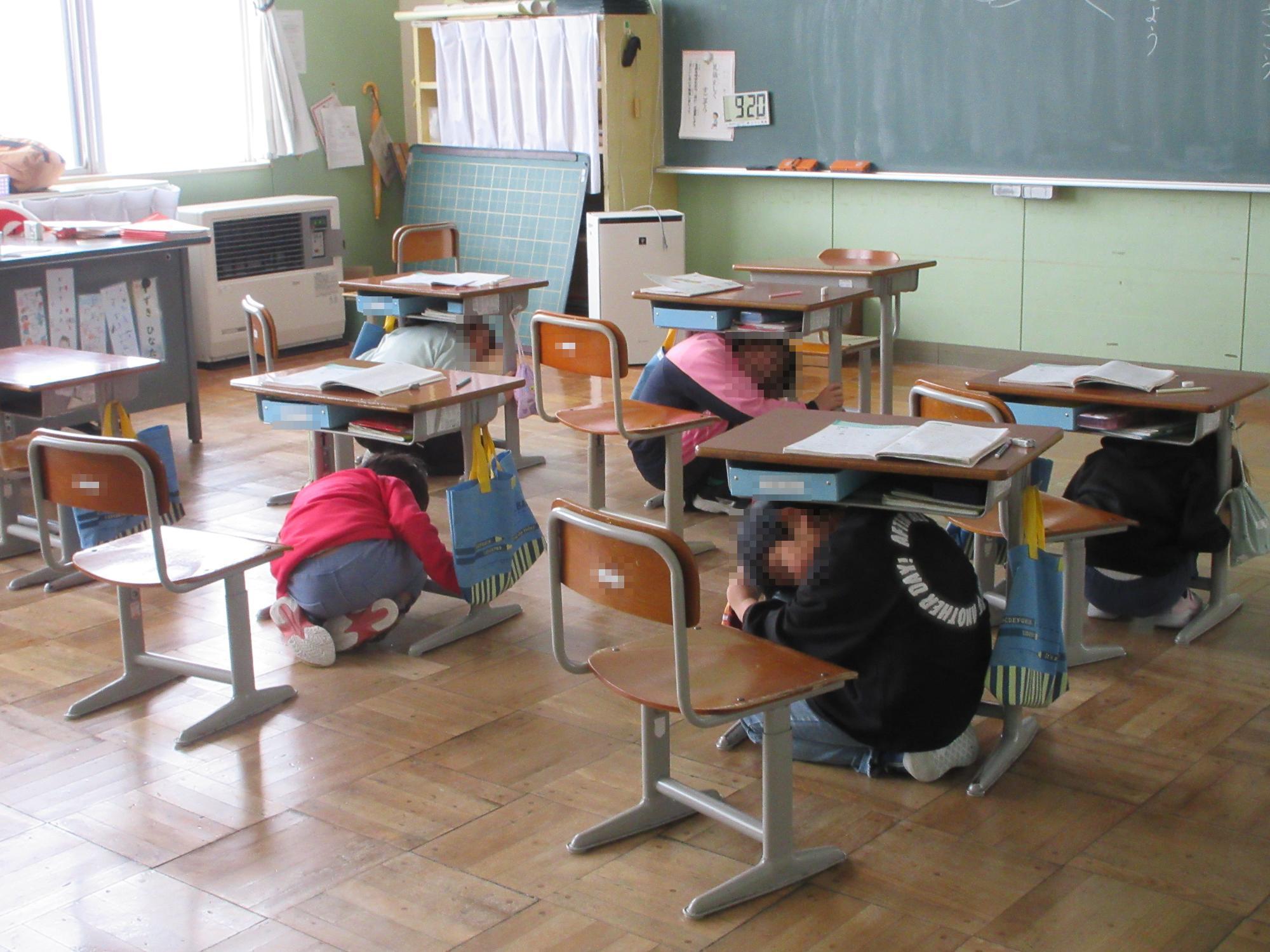 4回目の避難訓練は、積雪時に地震が発生したという想定で行われました。子どもたちは、机の下に隠れて机の脚をつかみ、身を守ることができました。