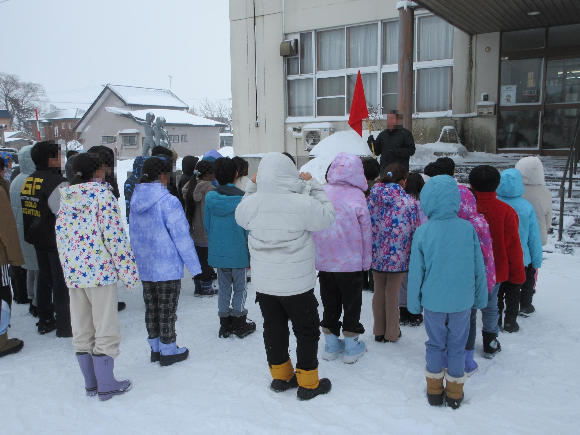 積雪時ということで、寒くないようにしっかりと上着を着て、靴も冬靴や長靴に履き替えて、無事に全員が前庭に避難することができました。
