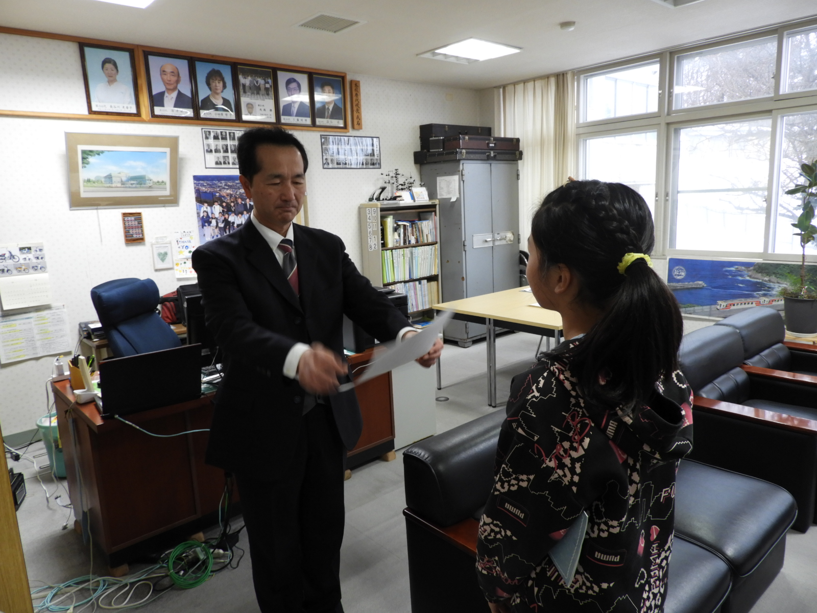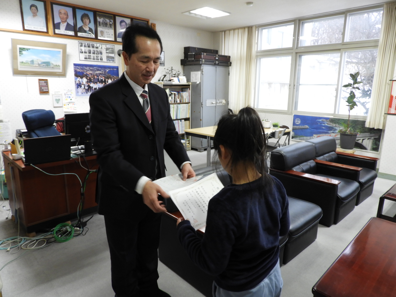 冬休み期間に自由研究に取り組んだ2人を校長室で表彰しました。