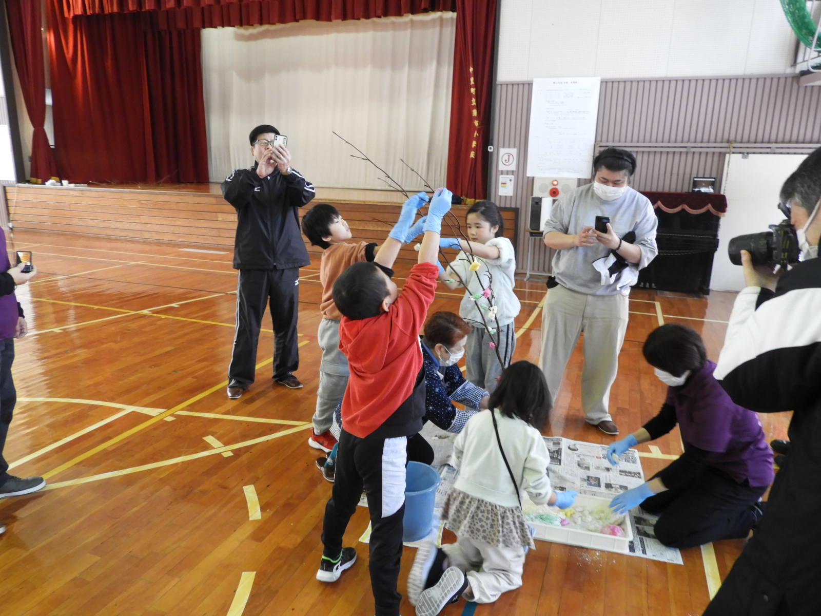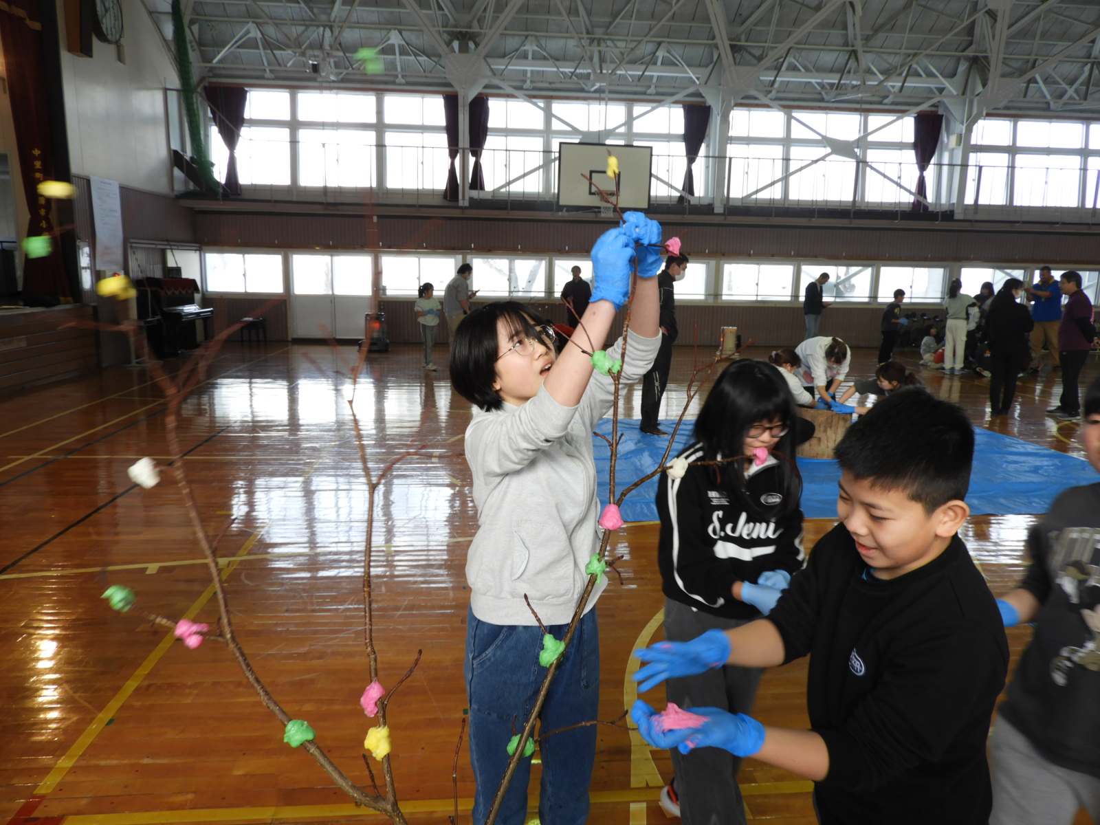 つきあがった餅に色付けをし、各学年のミズキの木に繭玉としてつけていきます。