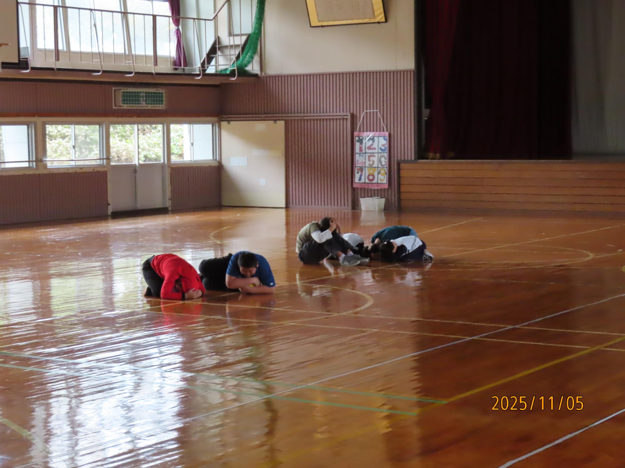 体育館で遊んでいた子も中央に集まって姿勢を低くできました。