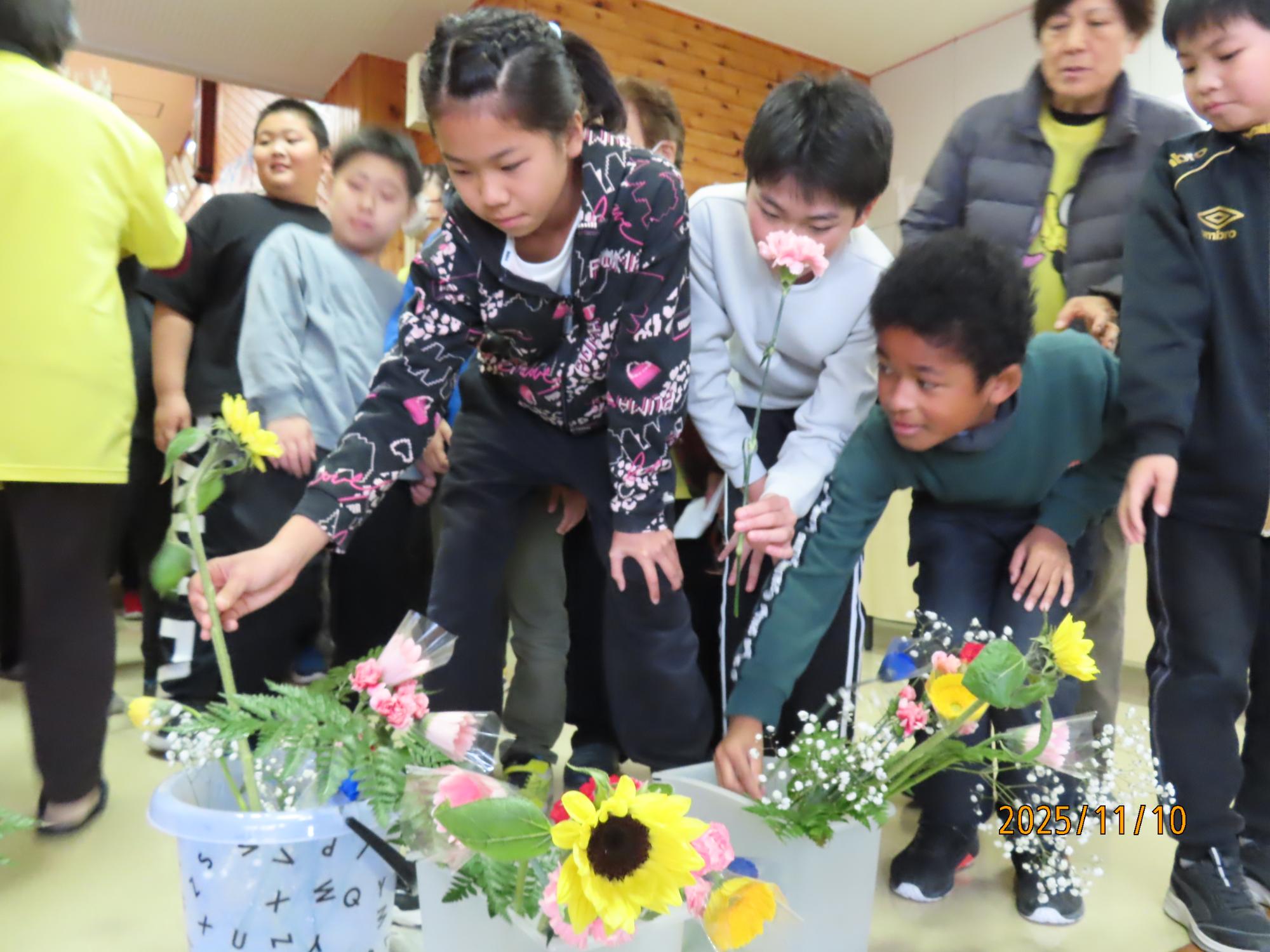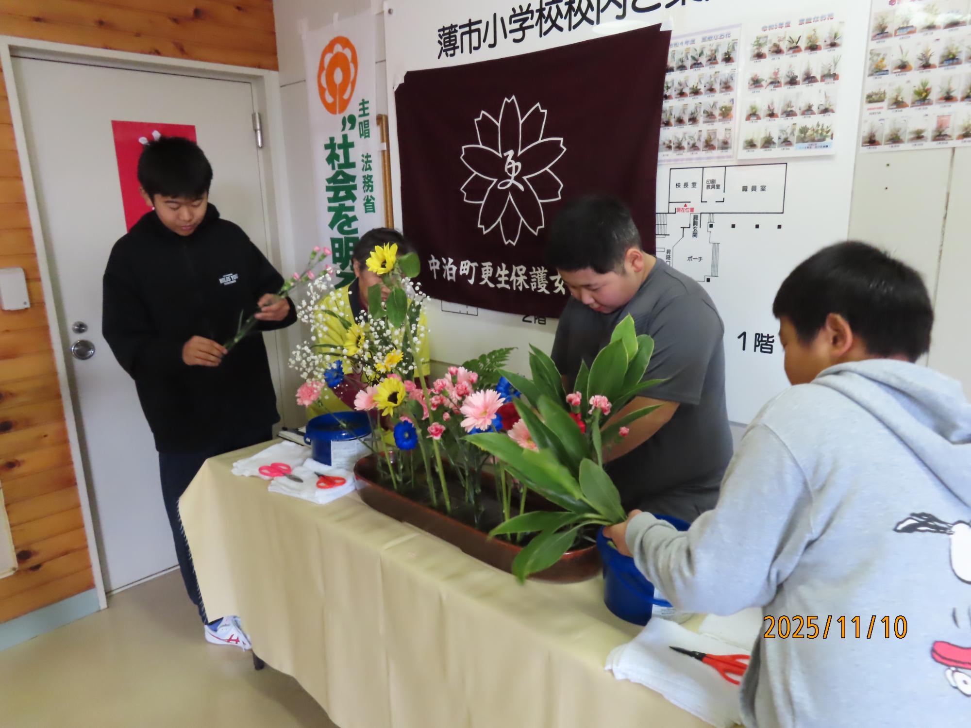 町の更生保護女性会の皆さんが来校され、生け花体験学習が開催されました。