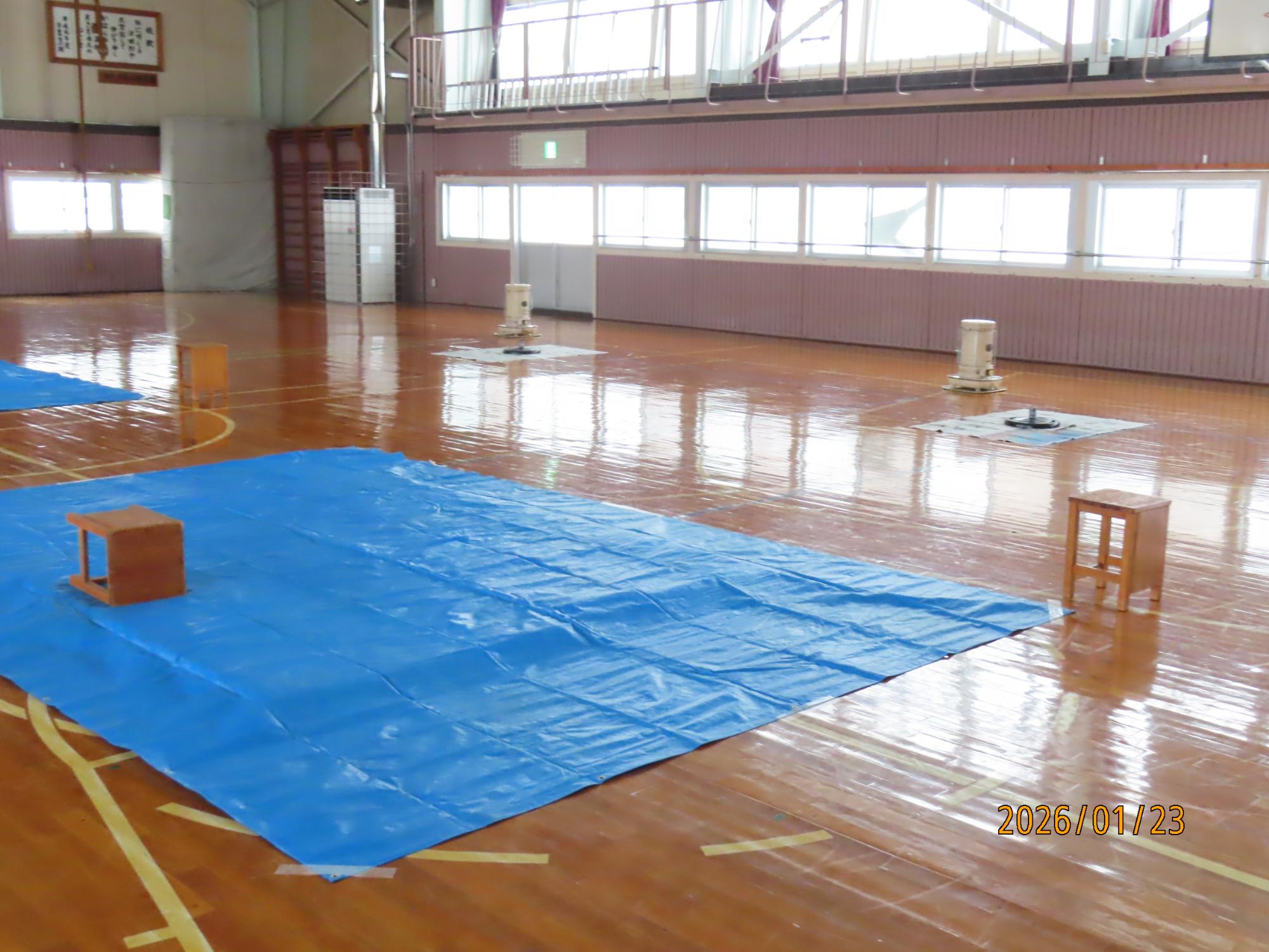 床が傷つかないようにマットをしいて、その上にかけられたブルーシート。
