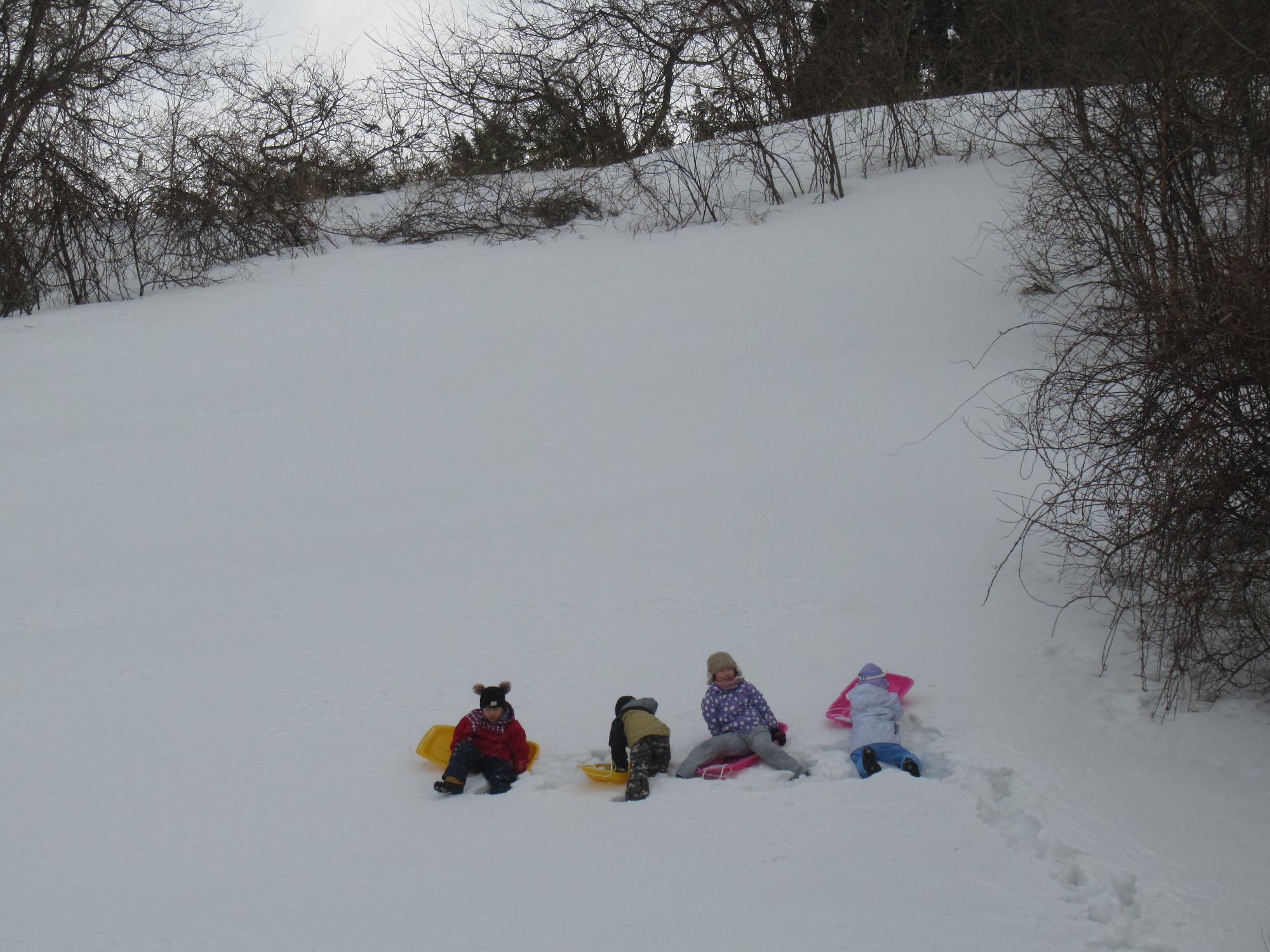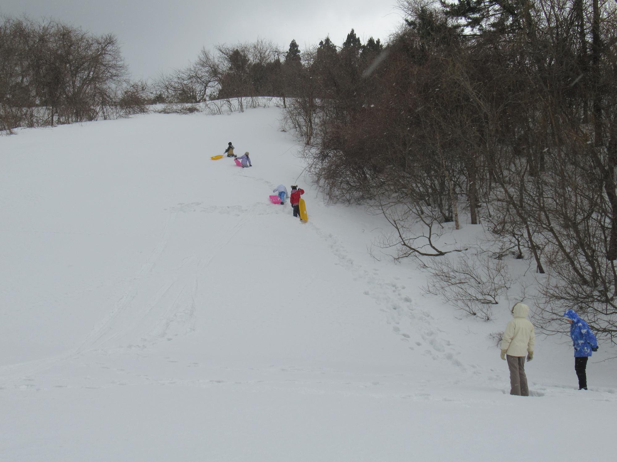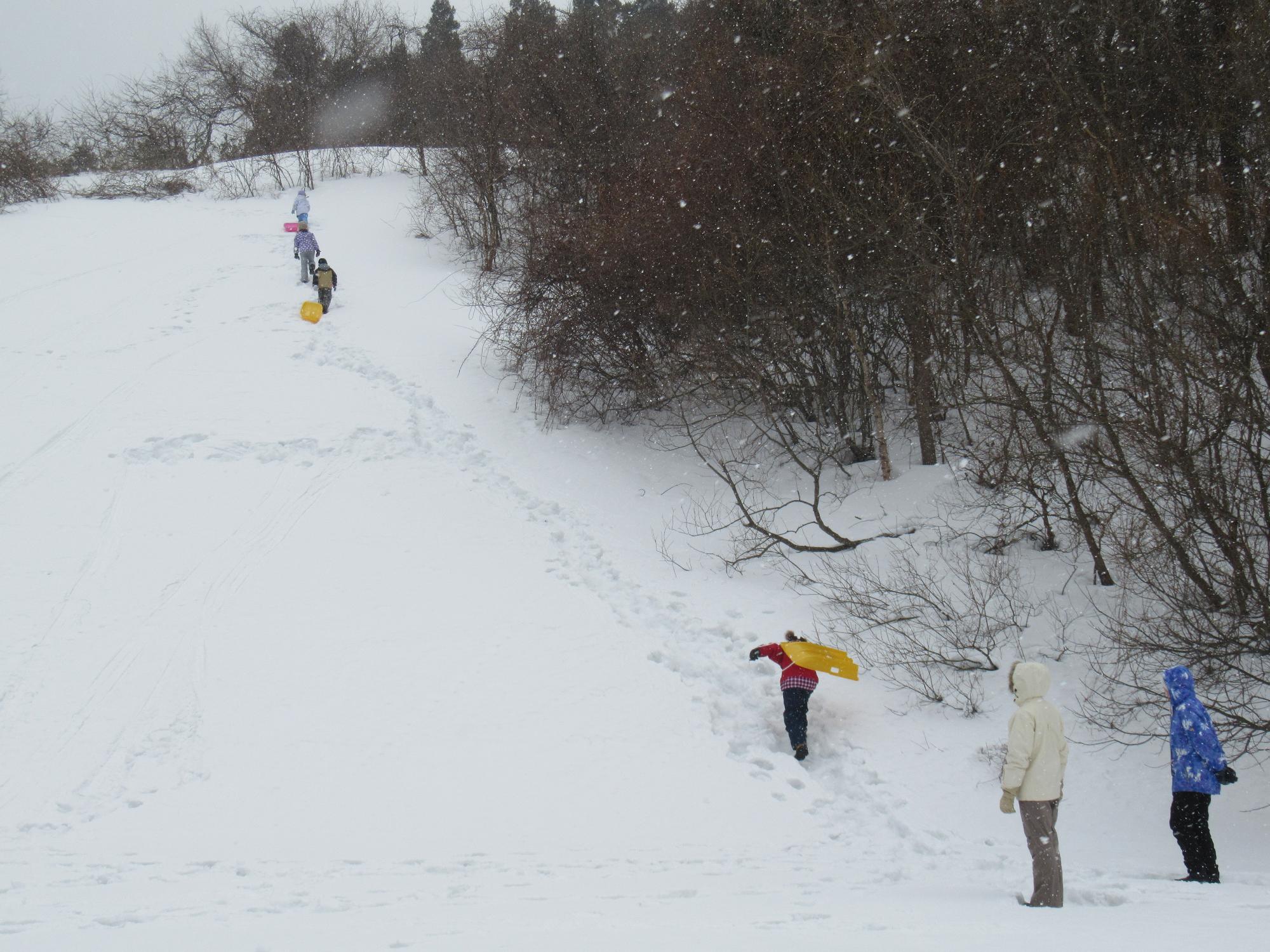 秋に刈り払いしてもらったすすき山でのそり遊び。